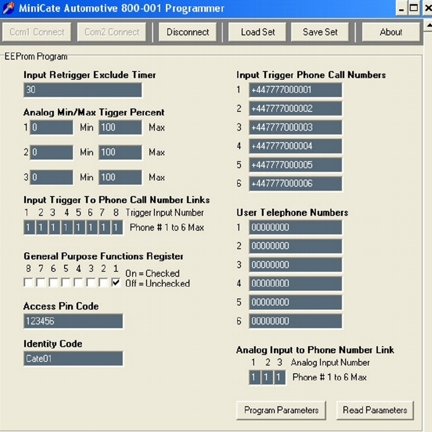 AutoCate allows you to control functions such as immobilisation and door locking in 12 and 24 Volt vehicles, or to control equipment in a static site. If any of its four zones that you selected are violated, AutoCate will alert you, or up to 6 nominated parties, via your cell-phone. AutoCate also has two analog inputs, which can be used to monitor temperature, pressure, climatic data, etc. - ideal for safeguarding frozen goods in transit.